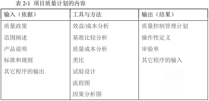 它所进行的计划或者安排是为了达到项目质量的目标。根据现代质量控制管理的思路和原则,质量控制的关键是制定的计划,而不是检查,由此可以看出质量计划在项目质量控制管理中的重要性。具体质量计划在制定过程中,要根据不同项目的建设特点,建设内容以及企业质量控制管理的标准或者文件进行。一般情况下质量计划的内容有:计划使用范围以及所要达到的标准;质量控制的过程、步骤以及可以采用的工具,一般通过流程图进行表示;质量控制过程中所有人员和岗位职责的分配;作业标准和指导书的制定;项目在实施过程中检验、试验以及评审等需要的操作大纲;质量计划实施程序;质量目标实现的检测方法以及可以采取的改善措施。