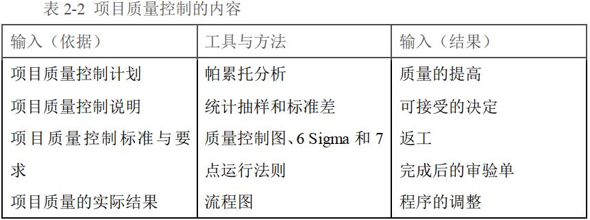 质量控制的依据是输入,包括了控制计划、控制说明、控制标准、控制要求以及实际质量等。控制过程中可以采取的工具包括了流程图、Sigma、控制表、检验表以及趋势分析等工具。控制完成之后得到的输出结果是项目或者产品质量提升、重新返工、能够满足要求以及程序调整等等。