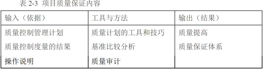项目质量保证的依据,包括项目质量控制计划、质量控制度量的结果及操作说明。审核则是质量保证中常用的措施,进而得到项目质量控制过程中的经验和教训,使整个项目控制的水平和质量提高。该环节同样要完成质量预期和实际之间的对比,从而帮助管理人员及时发现项目实施过程中的薄弱环节,并且制定切实可行的管理措施。