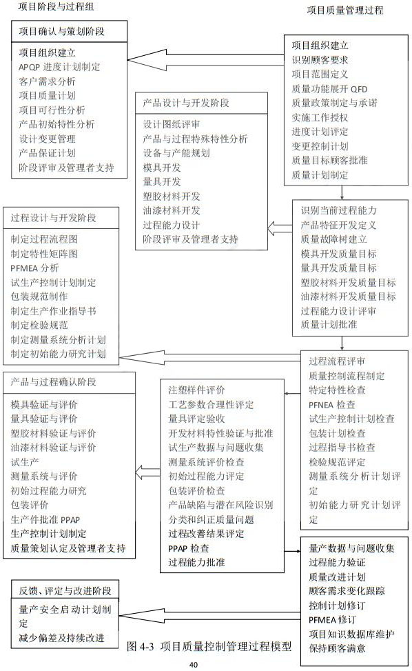 针对汽车面板零件开发项目,该项目的质量目标是根据客户认可及期望的定义可达成的质量目标。实际项目实践中,相应的项目质量目标作为供方开发项目的目标都是由客户所定义的。项目质量控制管理过程模型如图4-3所示(见下页)。该模型和APQP流程完全相符,注重面板生产过程中的过程控制,实现了项目质量的提升,确保了客户的满意度,使项目质量控制管理真正在面板开发的整个寿命周期中发挥作用。