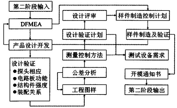 在第二阶段的开发过程中,以第一阶段的输出文件作为第二阶段输入,完成第二阶段输出,流程如图3所示。在该过程中,DFMEA(Design Fail-ure Mode and Effects Analysis)作为关键交付及管理手段,结合测量及测试方法不断更新解决设计中遇到的失效问题,确保设计的产品满足使用要求。通过产品边界设计氢传感器敏感材料、电子器件原理图、内外结构数据模型图以及相互之间的关系,并制定相应的验证计划及测量测试规范。在第二阶段过程中的输出主要为氢传感器设计失效模式及后果分析设计验证、设计验证计划DVP&PVP、设计冻结评审、传感器工程图样、材料规范证明及第三方测试报告、样件制造计划、样件控制计划、测试设备需求等。