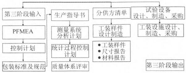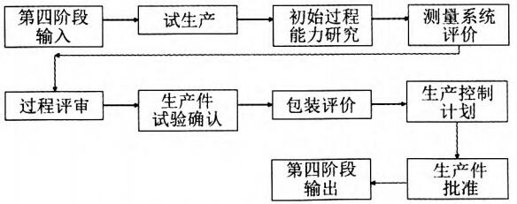 第三阶段输出为第四阶段输入,第四阶段具体主要输出物为有效生产、测量系统评价、生产控制计划、生产件批准等。产品质量管理遵循所有的项目控制计划和所有的过程流程图。