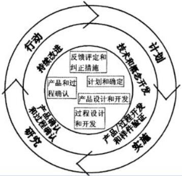 APQP认为产品开发就是一个产品质量策划过程,其目的就是向顾客提供满意的产品或服务开发。APQP是一种结构化的方法和流程管理工具,用来确定和制定确保某产品使顾客满意所需的步骤。APQP更愿意把产品开发看成为一个对产品的持续改进的PDCA循环,如图1: