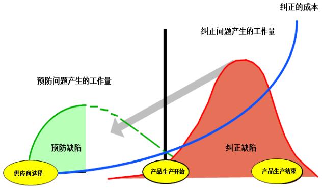 APQP的宗旨是强调在产品的研制生产初期就把质量工程理论和工具应用起来,全面做好质量控制的策划工作,其意义在于预防缺陷而不是纠正缺陷。如图2所示,先期预防性质的工作量及成本与后期纠正措施带来的工作量和成本变化对比鲜明。