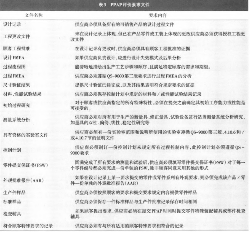 对PPAP进行评价时要求具有下列记录文件,其中某些项只适用于特殊的产品,例如外观批准报告,PPAP评价要求文件见表3。