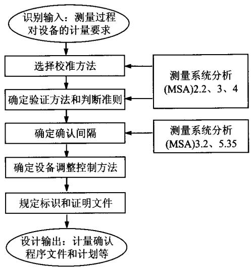 计量确认是为确保测量设备符合预期使用要求所需要的一组操作。通过按规定的确认间隔对测量设备的计量特性进行校准,并把校准结果与预期使用要求进行验证,以保证测量设备满足测量过程的计量要求。标准对计量确认过程的基本要求包括计量确认的设计和计量确认的实施两个方面。计量确认的设计主要是指计量确认程序的设计。MSA在计量确认设计中的作用如图2所示。