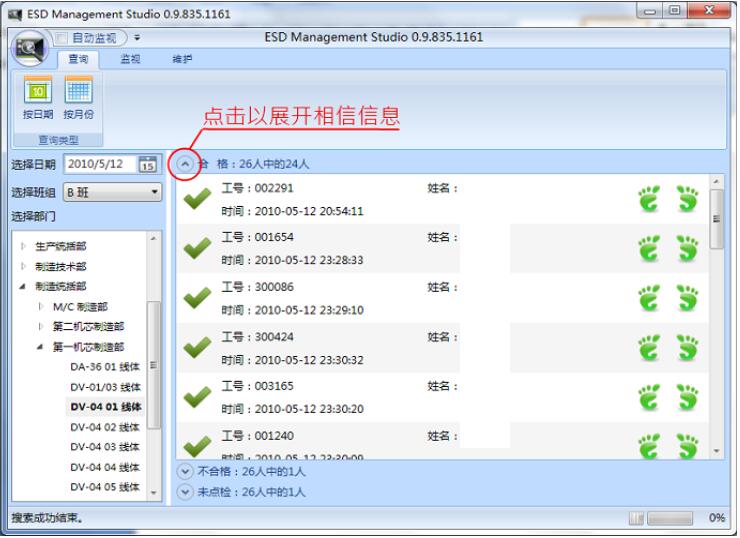 该模块主要负责对上岗前的所有员工进行静电点检管理并记录点检结果;管理者可对点检器上的点检记录进行确认管理,发现异常时可立即采取措施,确保对产品的有效静电防止保护。其原理是监视点检器本地的点检日志文件,当有新的记录(单位:行)被写入日志的时候,将实时获取该条记录的内容并上传到数据库中以便实现数据的全局共享。另外,由于实现了员工胸卡数据的统一管理,如图3.4所示
