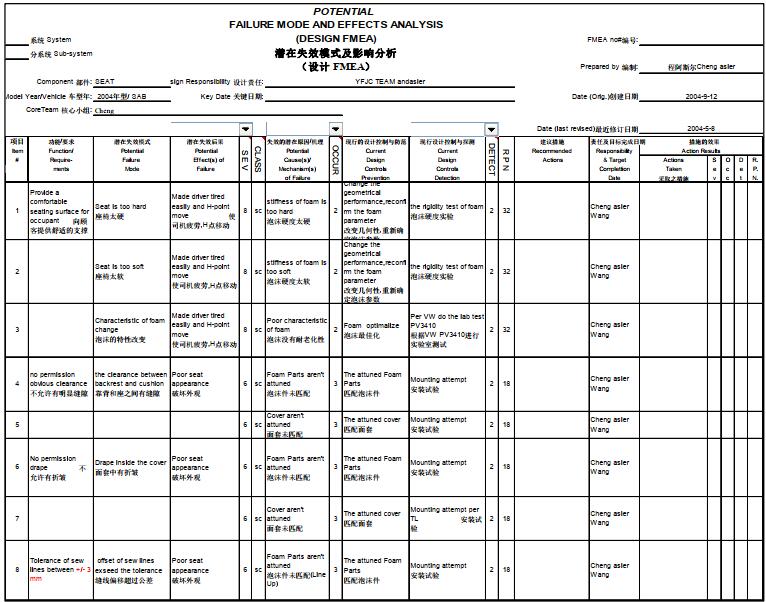 在TS16949质量管理体系中分为设计DFMEA(Design Failure Mode and Effect Analysis,DFMEA)和过程FMEA(Process Failure Mode and Effect Analysis,DFMEA)一般情况下DFMEA在一个产品设计概念形成时开始,在产品加工组装图完成之前结束,当然也必须针对开发各阶段发生的问题点进行及时修改、变更。
