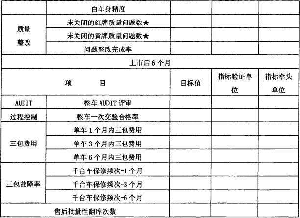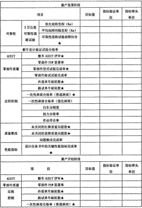 实施开发阶段量化目标管理,并分级控制。产品决策阶段,由质量师根据QFO及竞争车和标杆车型的评价和测量结果,初步确定新产品质量目标,目标确定阶段完成量产签署、量产开始、上市后6个月阶段的质量目标确认,并将一级质量目标纳入设计任务书中进行控制,并层层细化,制定爬坡二级质量目标。在重点里程碑,质量师对目标达成情况实施评审,对带★的关重指标项,必须达到目标,新产品才能转入下一阶段。SC63××项目一级质量目标,由集团总部牵头会同我公司共同确定,具体在设计任务书中下达 。表3.3 SC63××项目一级质量目标