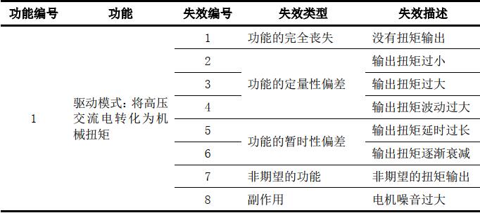 首先便是要基于其功能描述进行分析,按照失效所应具有的几种特征,推测其可能的失效。以电机驱动模式的主功能为例,其失效描述如“表6电机驱动模式主功能失效描述表”所示。