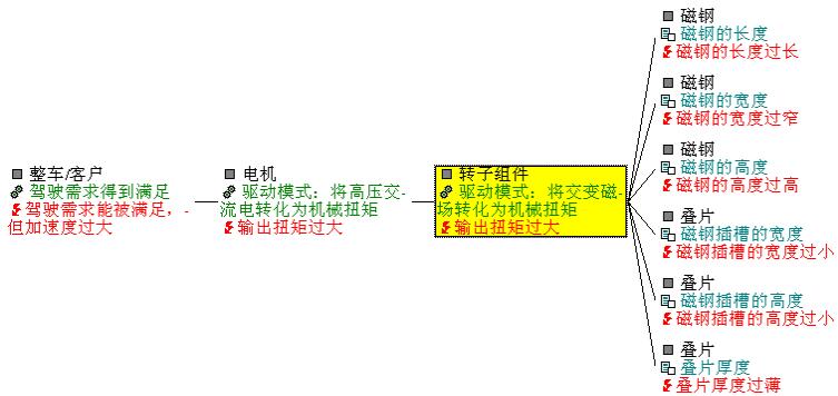 从图中可以看出,转子组件的“输出扭矩过大”失效会导致电机的“输出扭矩过大”失效,并最终导致整车/客户层的失效影响为“驾驶需求能被满足,但加速度过大”;同时,该失效的原因在叠片、磁钢等零件层面上逐步得到细化,并最终定位于叠片“磁钢插槽的宽度/高度”、“叠片厚度”、磁钢的“长度/宽度/高度”等产品特性方面的根本原因。