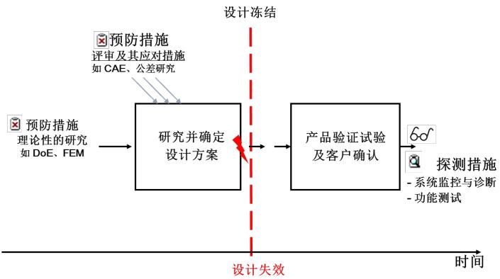 预防措施即避免失效发生的所有预防性措施,对于设计FMEA而言,这些措施主要实施于产品的设计阶段以避免失效原因的发生,以此降低其发生的概率。例如:参照设计指南或规范、研究性的试验、模拟、可靠性计算等。