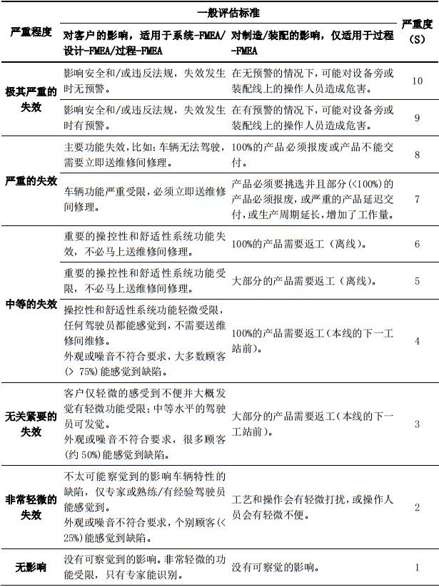 严重度(S)表示的是,在该失效已经发生并且没有被探测到的情况下,其潜在失效影响严重程度的等级。故严重度的评分是针对失效影响的。对于该FMEA所依据的严重度评分准则,如“表7FMEA严重度(S)评分准则表”所示。