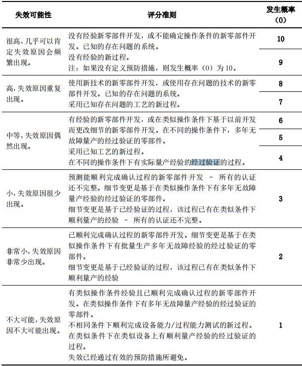 发生概率(O)表示的是,在整个产品生命周期内,该失效原因所发生的估计概率。对于该FMEA所依据的发生概率评分准则,如“表8FMEA发生概率(O)评分准则表”所示。