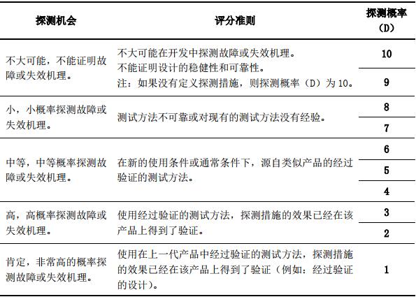 探测概率(D)表示的是,在特定的条件下,使用当前的探测方法,在失效网络上发现失效或失效原因的估计概率。对于该FMEA所依据的探测概率评分准则,如“表9FMEA探测概率(D)评分准则表”所示。