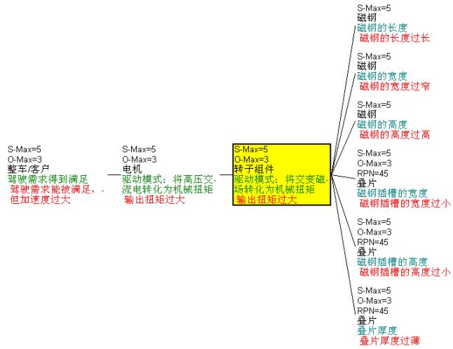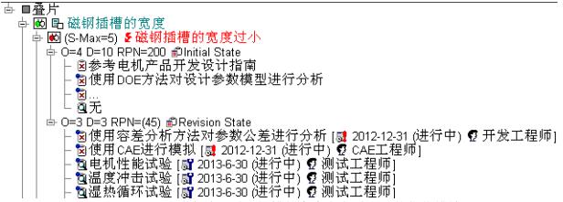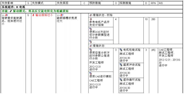 FMEA分析的第四个步骤和第五个步骤便是措施分析和优化改进。在FMEA措施分析完成之后,并可以依据其结果制定其他措施进行优化改进,之后便依此生成正式的FMEA表格。此处以上一章中转子组件的“输出扭矩过大”失效网络为例,对其进行措施分析和优化改进。