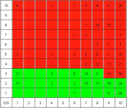 对于S/O风险矩阵,以严重度(S)为横轴,以发生概率(O)为纵轴构建一个S/0风险矩阵,如“表10S/O风险矩阵表”所示。其中红色区域为“S≥9且O>2”以及“S≤8且O>3”的高风险区域,即需要制定优化改进措施的区域;绿色区域为“S≥9且O≤2”以及“S≤8且O≤3”的低风险区域,其技术风险在可接受的范围内。