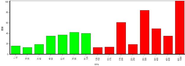 对于RPN分布频率,以RPN的分值为横轴,以失效原因的个数为纵轴,构建一个RPN分布频率图,如“图27RPN频率分布图”所示。其中红色区域为RPN值大于125的高风险区域,即需要制定优化改进措施的区域;其中绿色区域为RPN值小于125的低风险区域,其技术风险在可接受的范围内。