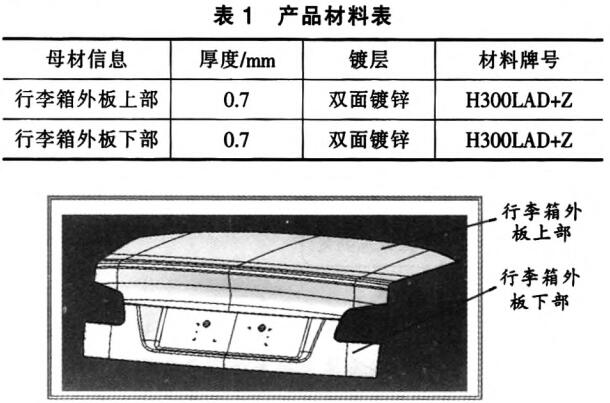 在汽车白车身制造中,行李箱外板分为上下外板两个零件,在焊装夹具上完成整个后行李箱的装配和焊接工作,形成整体的行李箱外板(见图2)。产品材料表见表l。