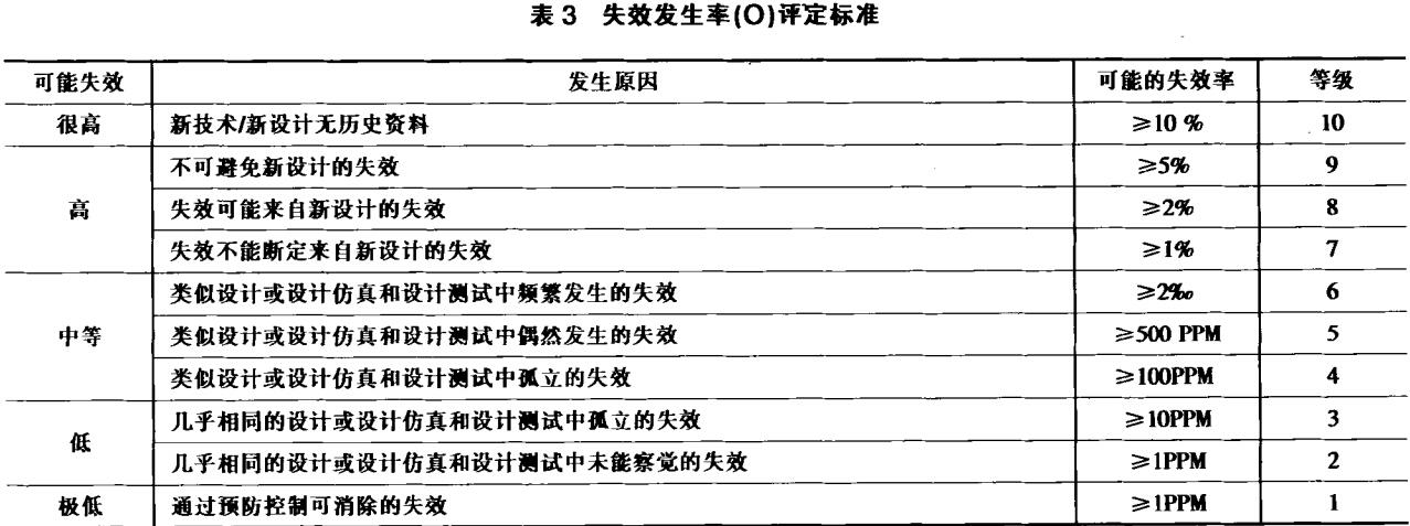 DFMEA过程的重要步骤之一是评价风险。风险从三个方面来评价:严重度Severity(S)、发生率Oc-currence(0)及探测度Detection(D)。严重度是失效对顾客产生影响的级别的一种评估:发生率是失效的要因可能发生的频繁程度:探测度是对产品或过程控制探测失效要因或失效模式程度的一种评价。