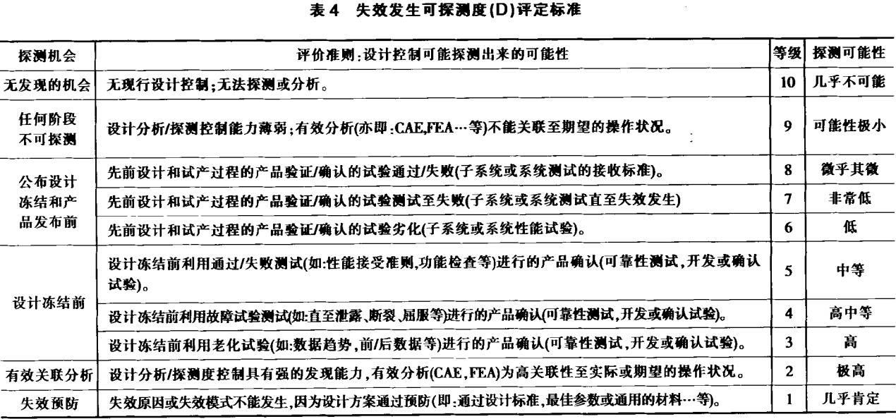 3)根据失效发生可探测度评定标准,“不能夹紧”失效模式的可探测度(D)评定为4分。