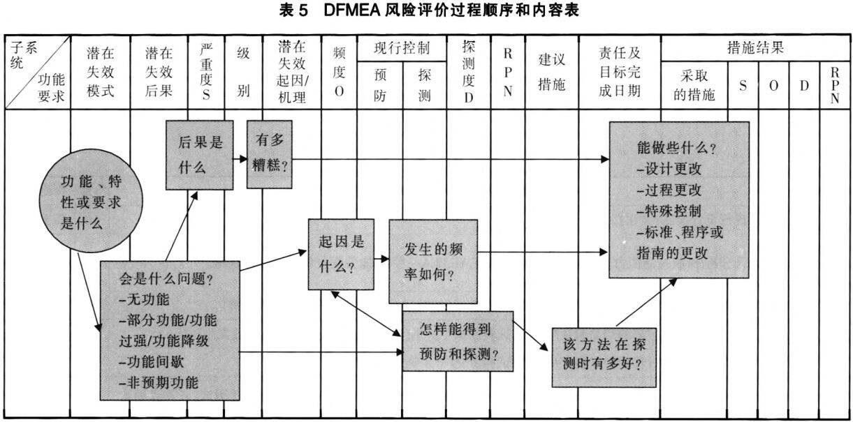 编制DFMEA的基本方法,是根据潜在失效模式及后果评定的三个方面,按照严重度、发生率及可探测度的评分标准进行风险评价,评价过程顺序和具体内容见表5。