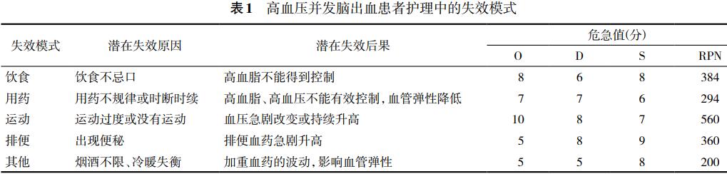 (2)分析潜在的失效模式:FMEA小组应用FMEA知识对研究对象预防再发脑出血护理措施中的饮食、用药、运动、排便等进行分析,发现潜在的失效模式,见表1。