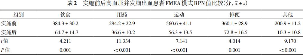 本研究通过应用FMEA模式对高血压并发脑出血患者再发脑出血的预防行分析,找出潜在的失效模式,采取积极有效的预防措施,对各种不安全因素进行控制,例如饮食、用药、运动、排便等。研究结果表明,干预后高血压并发脑出血患者的饮食、用药和运动等RPN值均低于干预前,差异有统计学意义(P<0.05);干预后高血压并发脑出血患者心理社会适应状况得分高于干预前,差异有统计学意义(P<0.05)。