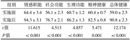(2)患者心理社会适应状况:运用医院自制的症状自评量化表格,医护人员对患者心理社会适应状况进行测评,调查表包括情感职能、社会功能、生理功能、精神健康及总体健康5个方面。采用百分制,得分越低表明患者自身存在的问题越严重。
