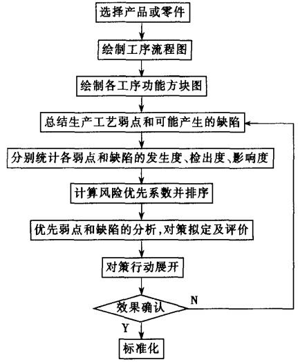 FMEA是根据经验分析新产品在设计与生产工艺中存在的弱点和可能产生的缺陷,以及相应的后果与风险,从而在决策过程中采取措施加以消除,以缩短新产品开发周期,累积专业技能。企业推广FMEA技术的大致运作流程如图1所示。