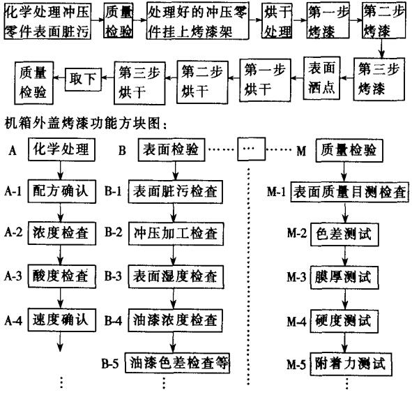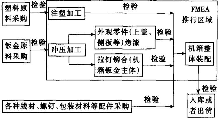 电脑机箱的大部分零件是冲压成形的,工艺上较塑料零件更难以控制,为此机箱质量主要取决于冲压零件的生产工艺性和装配工艺性。它所提供的“支架”功能是机箱最主要和最基本的功能,为了能够准确地“支撑”电脑系统的相关组件,电脑系统要求机箱有相当高的装配精度。因此,在机箱新产品中运用FMEA技术时,选择机箱的冲压零件作为FMEA的分析目标,主要涉及到冲压加工、烤漆和拉钉三部分。首先做出类似图3所示机箱的各个冲压零件的工序流程图和功能方块图(以机箱外盖烤漆为例),并填人各相关FMEA分析表(见表1)。