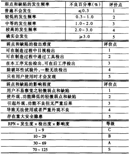 (2)对以上弱点和缺陷的发生度(是经常发生,还是很少发生)、检出度(是容易被生产线发现,还是不容易被发现)、影响度(会导致报废,还是只需经过稍微修改即可)进行统计,并计算出风险优先系数(RPN=发生度×检出度×影响度)。