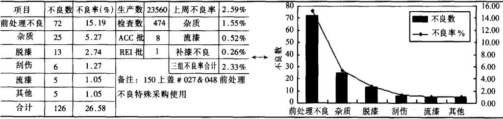 根据表2所示的日、周、月、季度等原始质量检验记录和现场生产实际经验,以及同类冲压零件大量生产中曾经发生的质量问题点,推出新冲压零件设计中可能存在的潜在生产工艺弱点和缺陷。然后在依据表1的发生度、检出度、影响度及风险优先系数的评价标准,分别统计出各缺陷的发生度、检出度、影响度,并计算出各自的风险优先系数。根据风险优先系数大小排序后,得出位于“S”级的缺陷是图4中H、1、J、K处的装配垂直精度(RPN=5x5x3=75);而位于“A”级的缺陷是图4中A、B、C处的外形尺寸精度和D、E、F、机箱外盖烤漆工序流程图:G处的装配长度精度(RPN=5x3x3=45);而其余各项则分别位于“B”和“C”级,不为优先考虑对象。