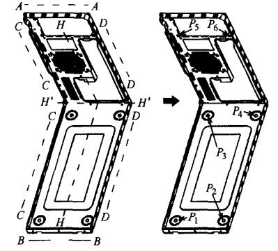 解决对策为改变定位工艺,利用底座内部本身的6个孔P₁-P6进行内缘定位,并在第1工序先成形这些孔,这样从第2工序到最后工序,都可以采用这6个孔中的某些孔作内缘定位,从而保证了底座前后定位的统一性。内缘定位能很好地控制H'-H'和H-H在±0.10mm的范围内。