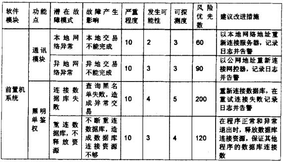 根据信用卡前置机子系统、后台处理机子系统的详细设计,由开发人员列出两个子系统的相关功能点和要素。邀请FMEA团队的所有成员开会,采用头脑风暴的会议模式,对开发人员列出的功能点的潜在故障模式发言菇次会议先不对各潜在故障模式的严重程度泼生可能性以以及可探渊性进行讨论,只记录可能的故障模式,集思广益,尽可能多的考虑各种潜在故障。会议完毕,由开发人员对列举的各种潜在故障模式进行归类,找出通用性的故障模式。