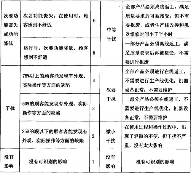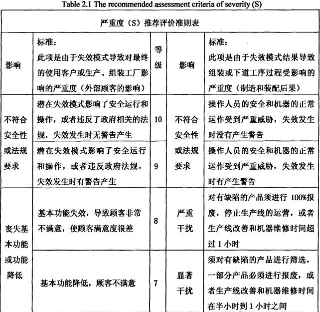 严重度表示潜在过程失效模式影响的严重程度等级,是对顾客或者下道工序影响后果的评价指标,在PFMEA中,严重度等级应以失效模式的不良最影响为基础,根据其严重度进行排序分级。推荐的评价准则见表2.1所示: