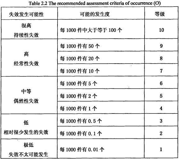 发生度是指导致产品或者过程出现失效模式的起因其发生的可能性。一般在在1到lO等级范围内对失效潜在要因发生的可能性进行评估,在PFMEA范围内的发生度排序值是一个相对等级,不一定反应发生的真实可能性。表2.2是推荐使用的评价准则: