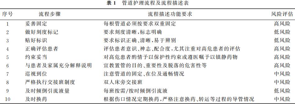 为了更直观地对关键环节进行研究,识别其中的薄弱环节,以及进行初步评估,分析团队小组成员根据经验以及我院现行管道护理的实施步骤,绘制流程描述表(见表1),并对每个步骤的风险进行集体评级。