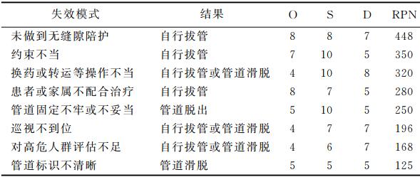 我院通过分析团队的现况调查及分析,找出存在的失效模式及其根本原因,并针对这些失效模式制定相应的对策,逐一落实,通过全方位培训提高员工知识、技能水平及应对能力,通过建立统一的管道安全标识及动态监控记录,使我院非计划性拔管的防范措施落实情况得到明显加强,尤其是处于高风险的前5项失效模式的RPN值显著下降。