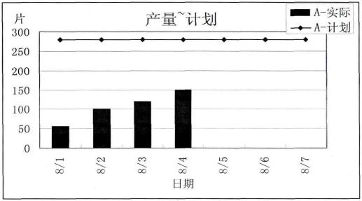 i)产品作业量和计划量:图4.6.3.6和图4.6.3.7分别表示了A,B两种产品的产品作业量和计划量运行图,在某年的8/1-8/7的生产周期内,B产品很明显立刻就要完成生产指标,此时可以通过调整A和B产品的作业设备比例来提高A产品的日输出量,达成计划的目标。