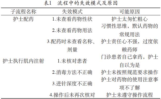 团队一起列出失效模式和原因:经过讨论我们认为在门诊肌内注射流程中护士配药和护士执行肌内注射操作是两个关键的流程,故对这两个流程中的每一个步骤列出所有的失效模式—也就是说列出所有可能出错或出问题的情况,包括较小和稀少的问题,然后针对每个列出的失效模式,找出所有可能的原因。见表1。