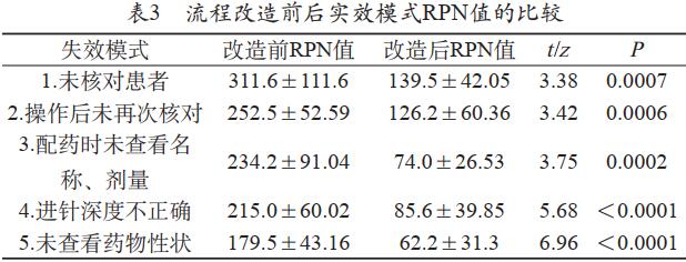流程改造前后实效模式的RPN值比较见表3,由表可见流程改造后RPN值均有明显的降低,差异有统计学意义(P<0.01)。