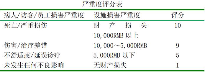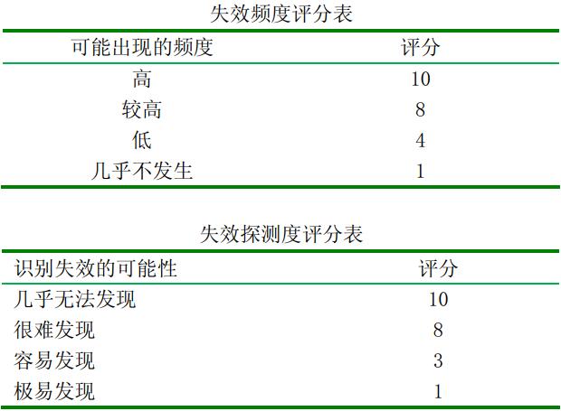 图1中,严重度是指潜在失效模式造成损害的严重程度,频度则是具体的失效原因发生的可能性,探测度描述了现行的系统无法识别失效模式或原因的可能性。每个指标的评分都从“1”到“10”。实际操作中,不一定非采用10分制,但必须保证评价标准的一致性。风险指数RPN(risk priority number)是严重度S、频度O和探测度D的乘积,取值在1到1000之间。RPN越高,风险越大。它确定了行动的优先级,即首先对排列在最前面的问题和项目采取纠正措施。下面是例举的评分表格。