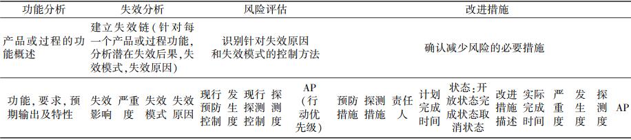 FMEA的组织形式是多方论证的结果,参与人覆盖到产品设计人员、现场操作人员、产品检验人员和设备维护人员等跨单位的专业人员来共同完成。分析方法通常为头脑风暴法和经验。FMEA的开发流程模式大体分为四个部分:(1)确定产品、过程及设备的功能分析;(2)针对产品或过程功能,分析潜在失效后果,失效模式,失效原因;(3)识别针对失效原因和失效模式的控制方法及优先等级;(4)确认减少风险的必要措施。详细流程模式,如表1所示。